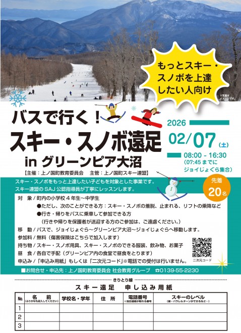 上ノ国町教育委員会では町内の小学4年生~中学生を対象とした「バスで行く!スキー・スノボ遠足inグリーンピア大沼」を2月7日(土)に実施致します。