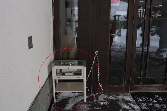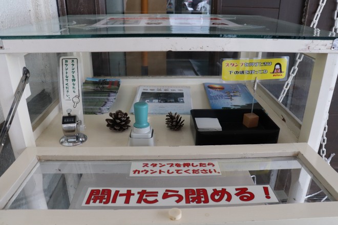 ③スタンプ台中央の扉を開けると中にスタンプとパンフレットがあります。