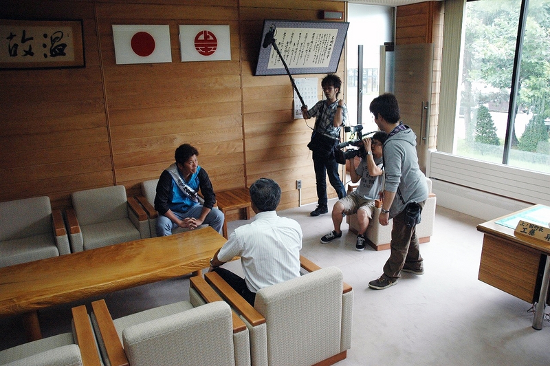 この日、応対した佐藤博副町長は稲田氏と会談し、上ノ国町民が今年2回バスツアーにより札幌ドームを訪れ応援していることや上ノ国の名物などについて伝え、その後稲田氏は町内各所を取材しました。
