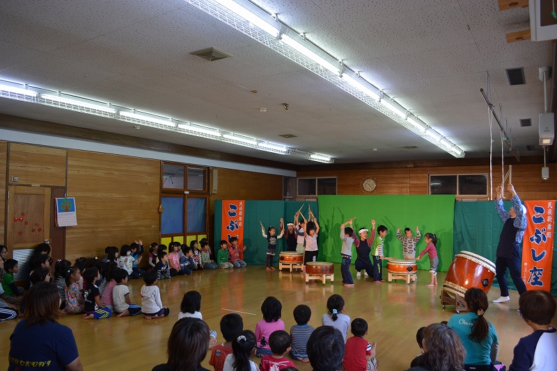 この公演は豊かな心と芸能への関心を育むことを目的に行われており、園児達はソーラン節や江良杵振り舞などを見たあと、出演者と一緒に太鼓をたたいたり、出てきた獅子舞を見て驚いたりと楽しんでおりました。