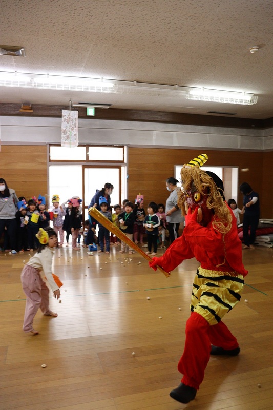 鬼たちは、「保育所に悪い子がいる」との噂を聞きつけ、保育所内で暴れ回りましたが、園児たちに豆をぶつけられると降参しました。