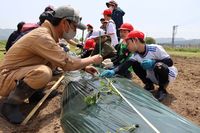 上ノ国小学校では、北海道農業士の山下敏晴さんが駆けつけ、一緒にサツマイモを植えました。