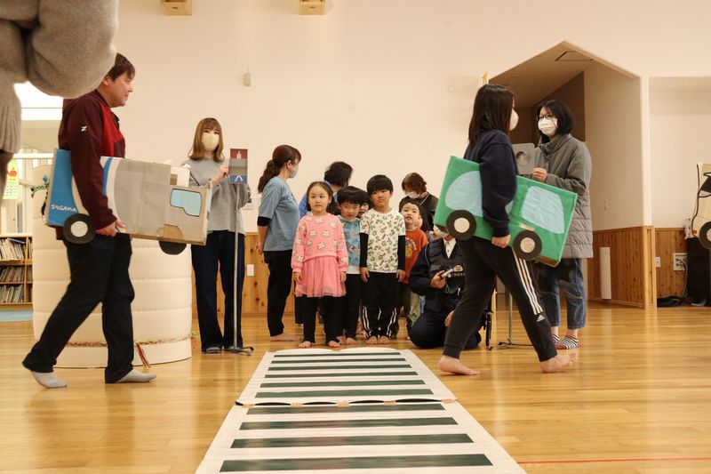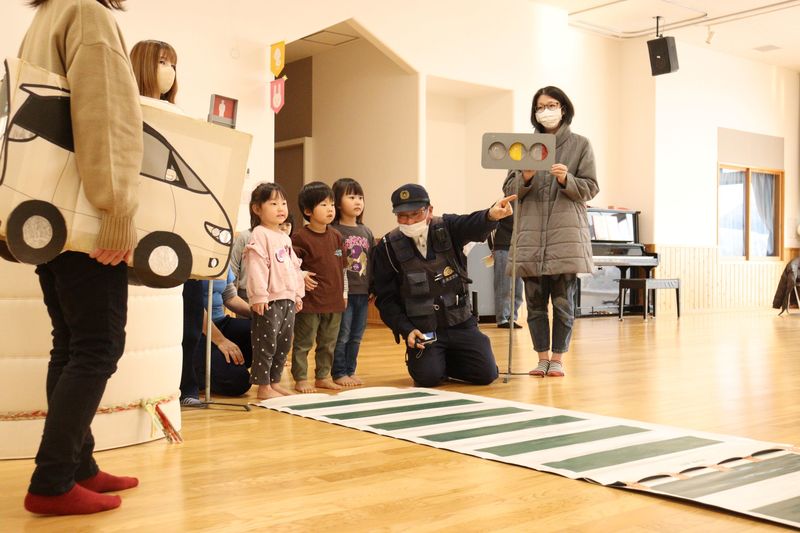 はじめに江差警察署の方から、防犯の合言葉「いかのおすし」について分かりやすく教えていただき、その後は実践編へ。ロールマットを歩道に積もった雪山に見立て、横断歩道を渡る練習を行いました。🏔