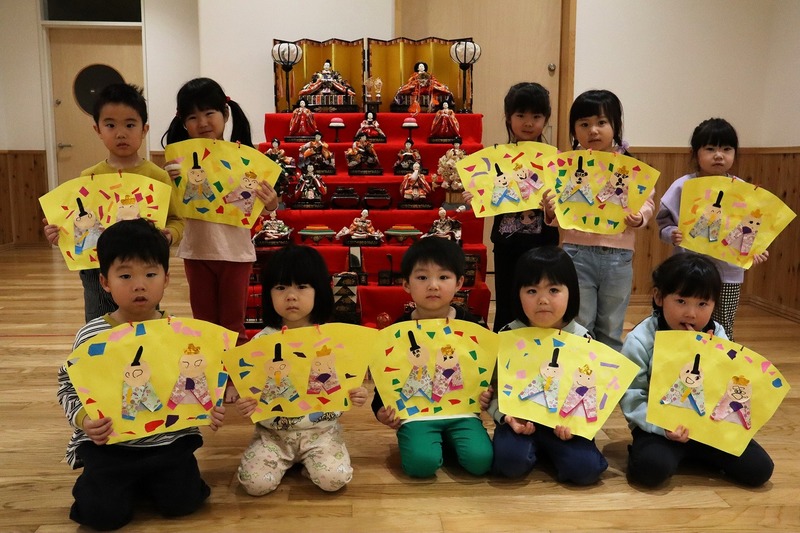 由来のは、ひな人形を1体ずつ、その役割や性格をクイズ形式で学習し、終わりには、歌と踊りで楽しく”ひな祭り”をお祝いしました。
