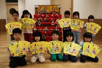 最後は、自分たちが作ったひな人形を手にして、雛壇の前で満面の笑みで、記念撮影しました。