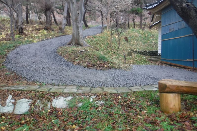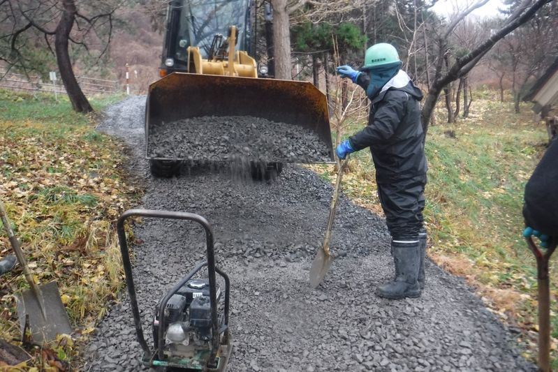 扇石町内会では、災害時に瀧澤神社から国道へつながる避難路の整備を検討しておりました。そこで、同地区で工事を行っていた豊成建設㈱からの申し出を受け、砂利を敷き、道路などを整備していただきました。