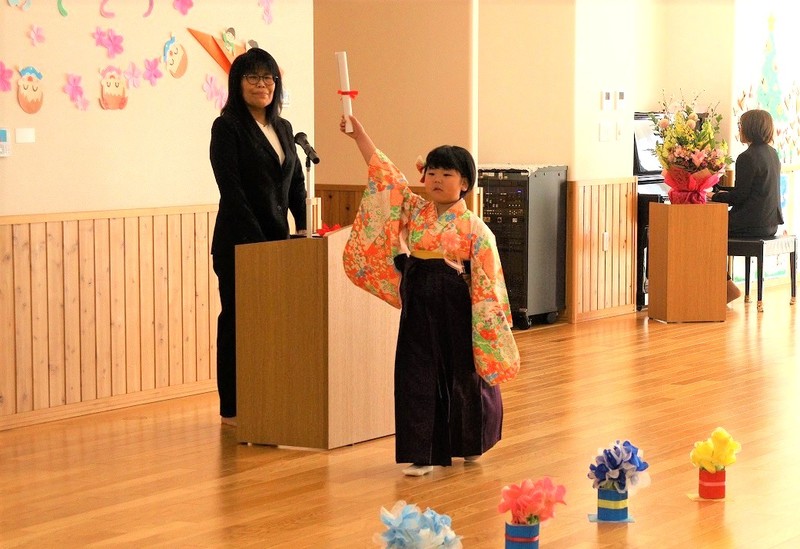 はじめに、卒園する園児14人がいつもとは違うスーツや袴などの晴れやかな姿で入場しました。その後、今泉先生から一人ひとり名前が呼ばれ、卒園証書が授与されました。園児たちは、証書を受け取ると「ありがとう」の声とともに、誇らしげに卒園証書を掲げ、ご家族にアピールしていました。