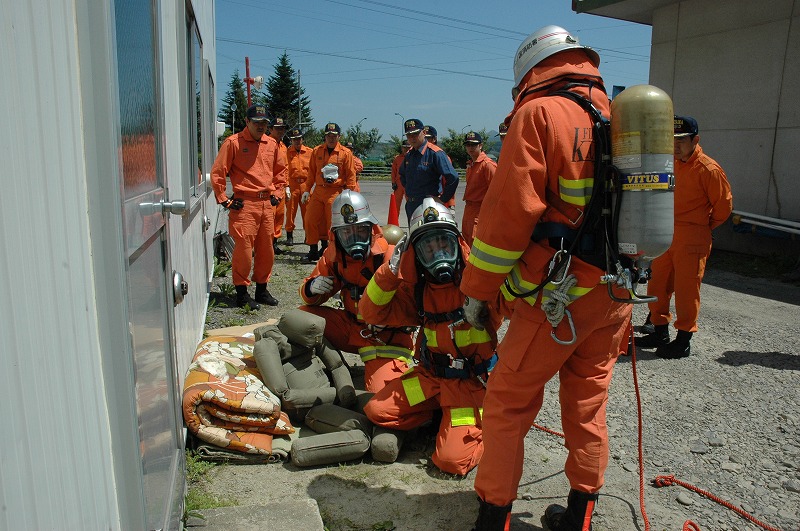 これは檜山南部にある5消防署(上ノ国、江差、乙部、厚沢部、奥尻)が合同で行うもので、事務所や工場内での濃煙火災を想定しての訓練となりました。